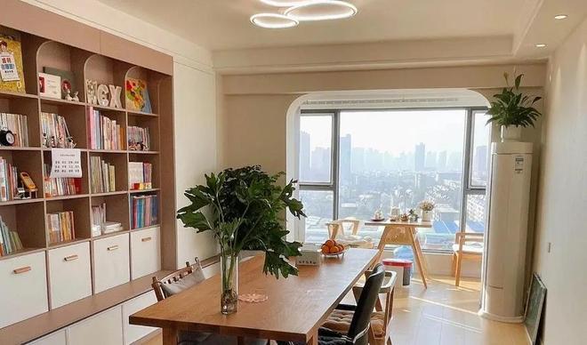 把客厅腾空,来一个大书架、长桌,一家人学习、办公、画画都能围坐一桌,彼此陪伴还互不打扰。